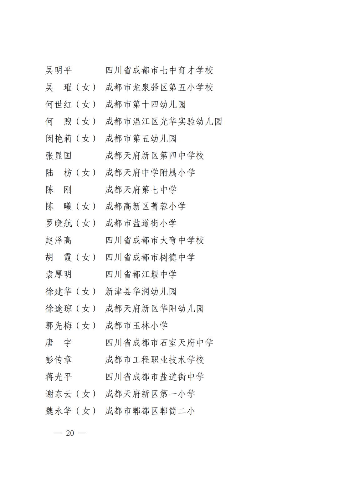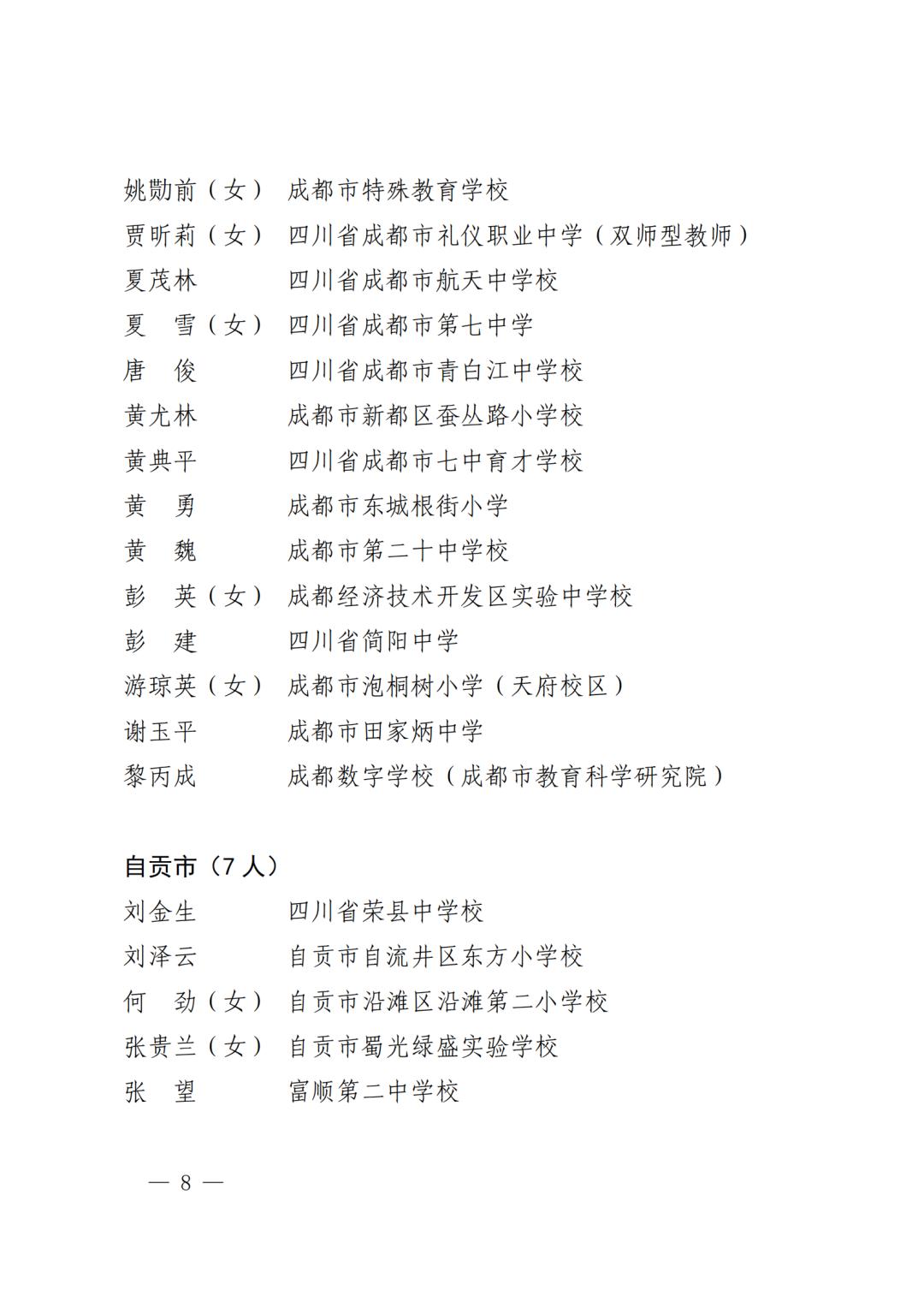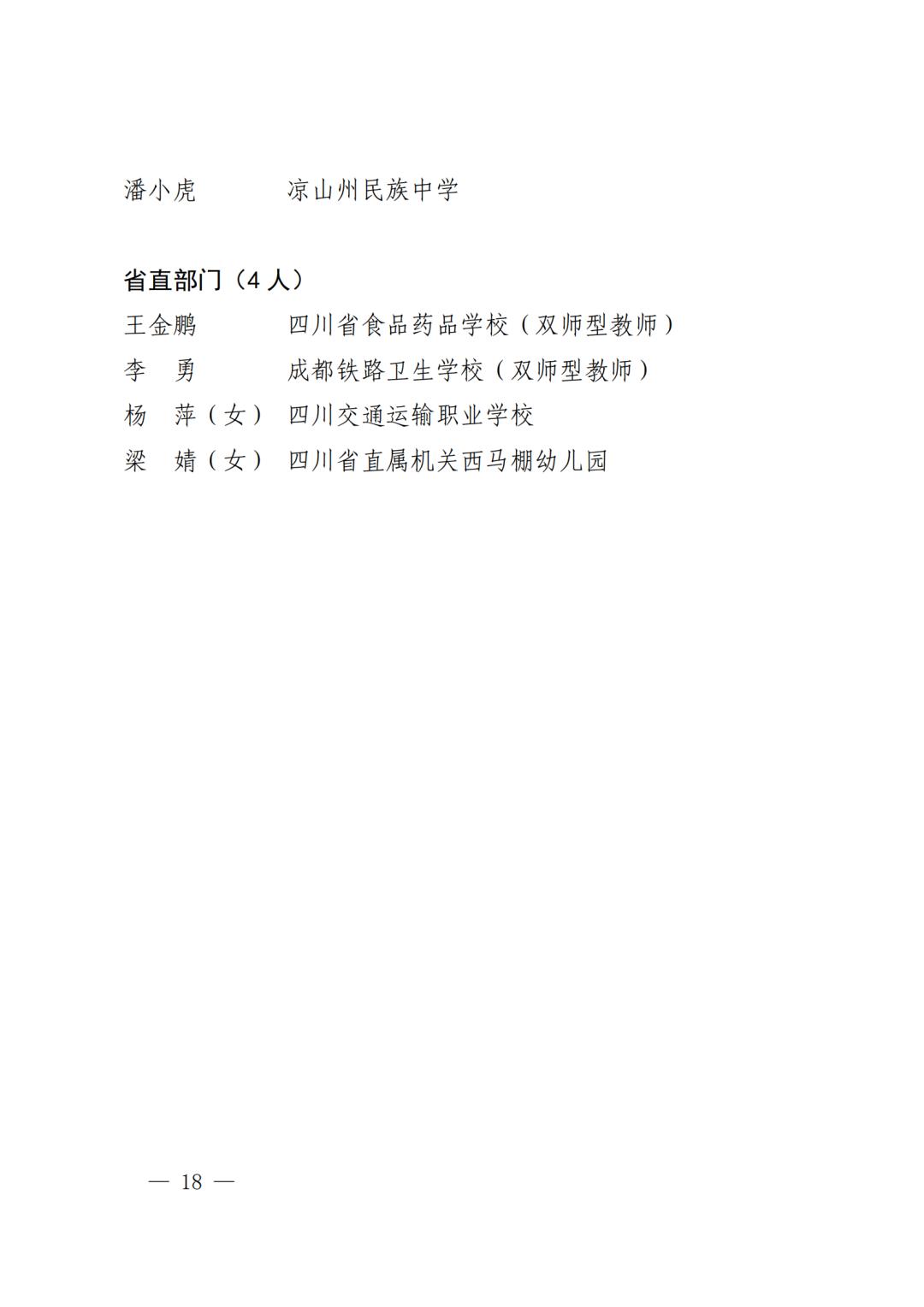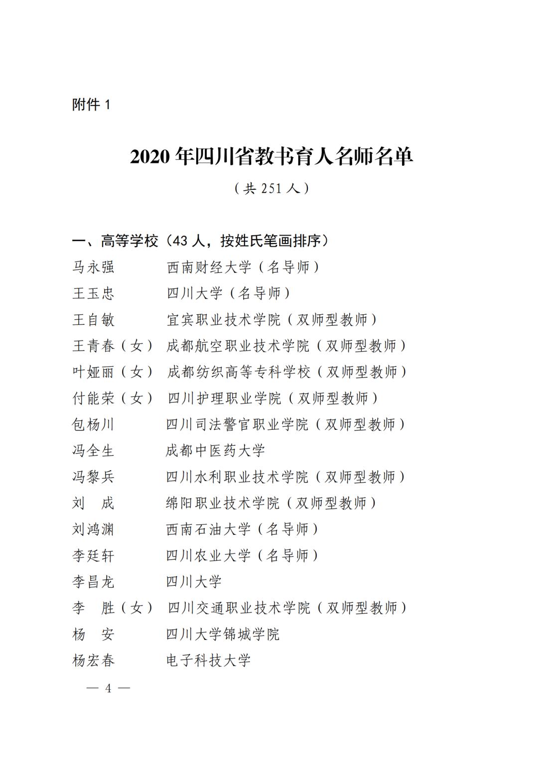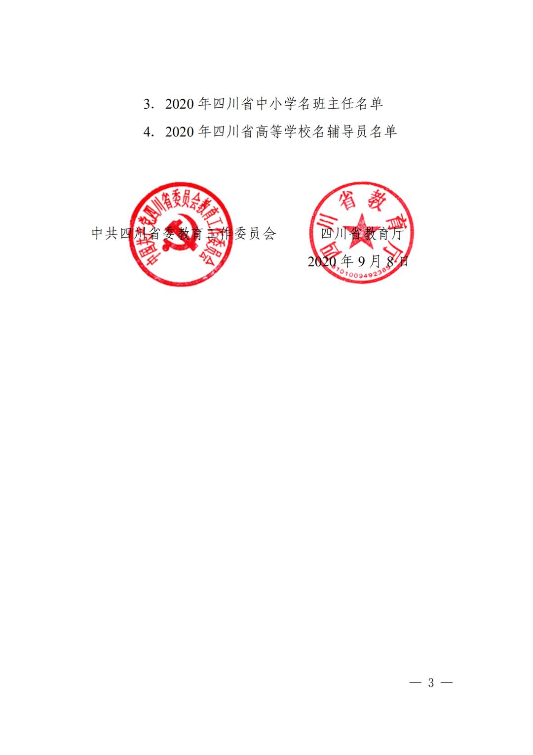 经层层推荐遴选,省委教育工委、教育厅决定授予马永强等251人“四川省教书育人名师”称号,王春等119人“四川省中小学名校长”称号,马杰等109人“四川省中小学名班主任”称号,马俊等20人“四川省高等学校名辅导员”称号。