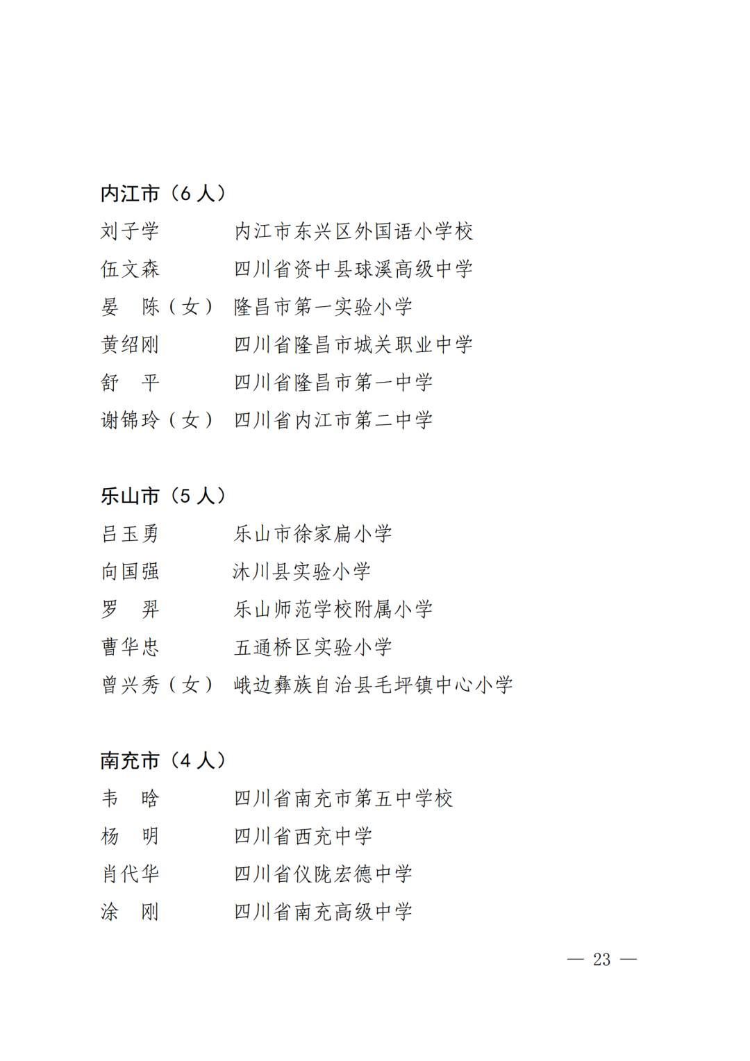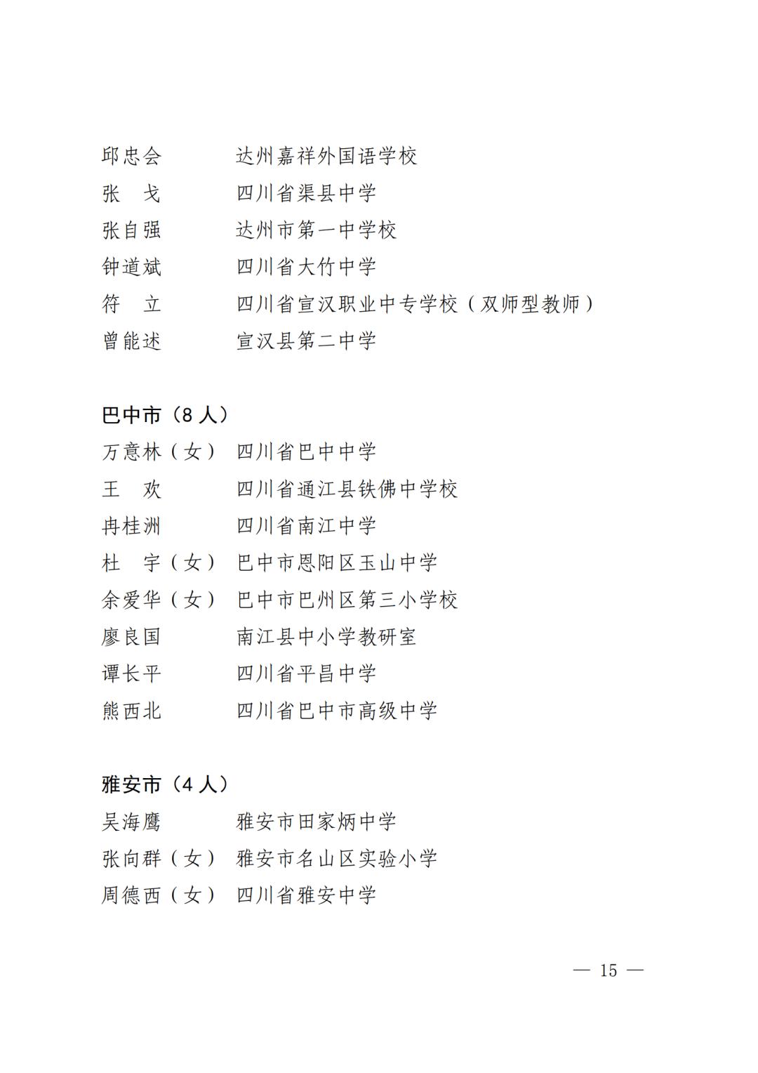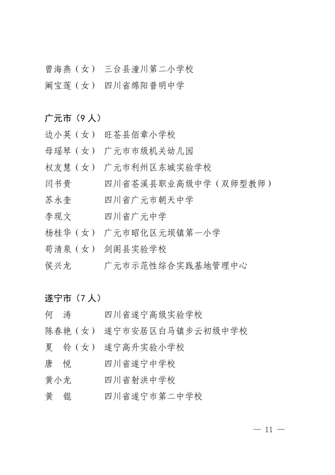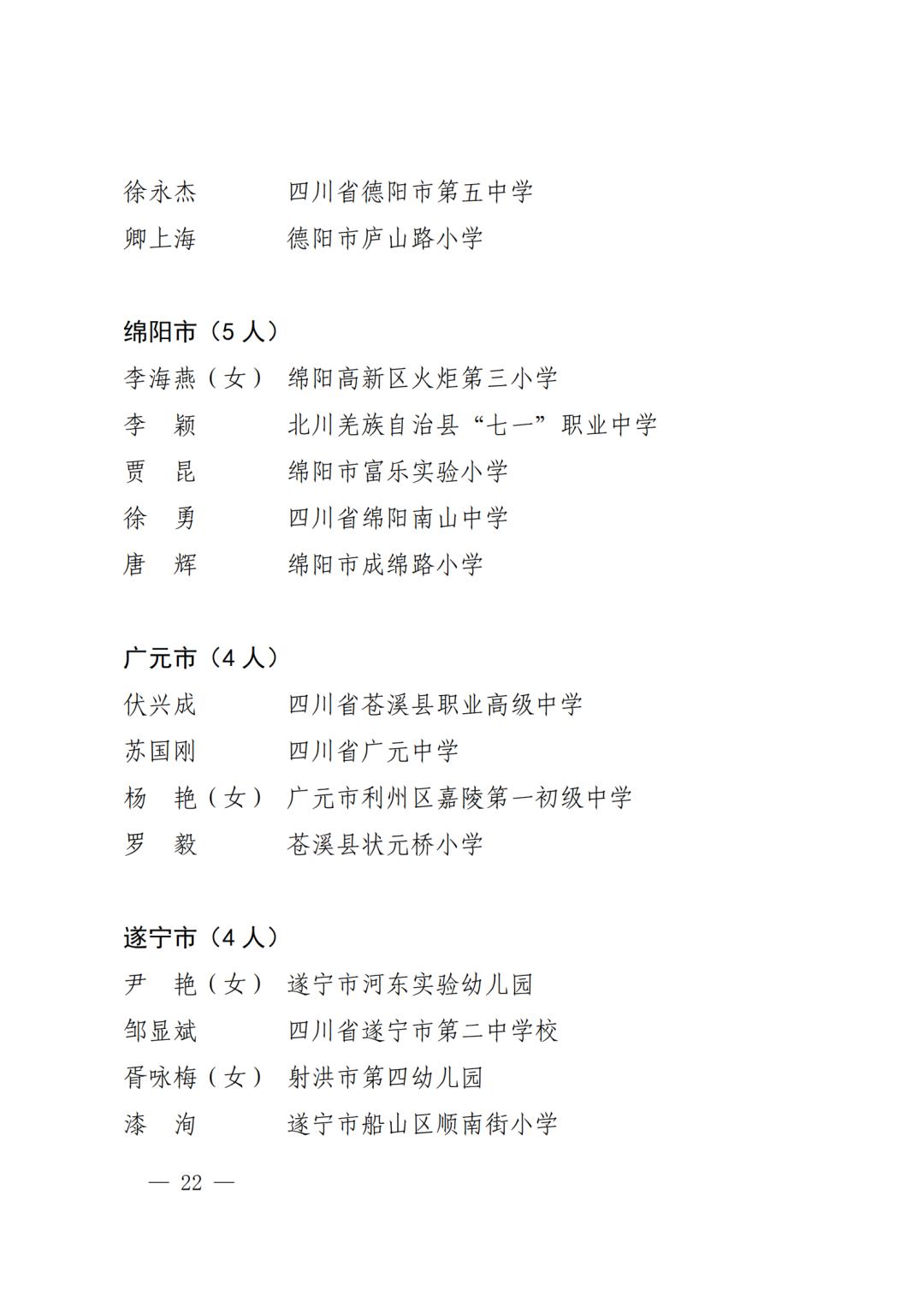 经层层推荐遴选,省委教育工委、教育厅决定授予马永强等251人“四川省教书育人名师”称号,王春等119人“四川省中小学名校长”称号,马杰等109人“四川省中小学名班主任”称号,马俊等20人“四川省高等学校名辅导员”称号。