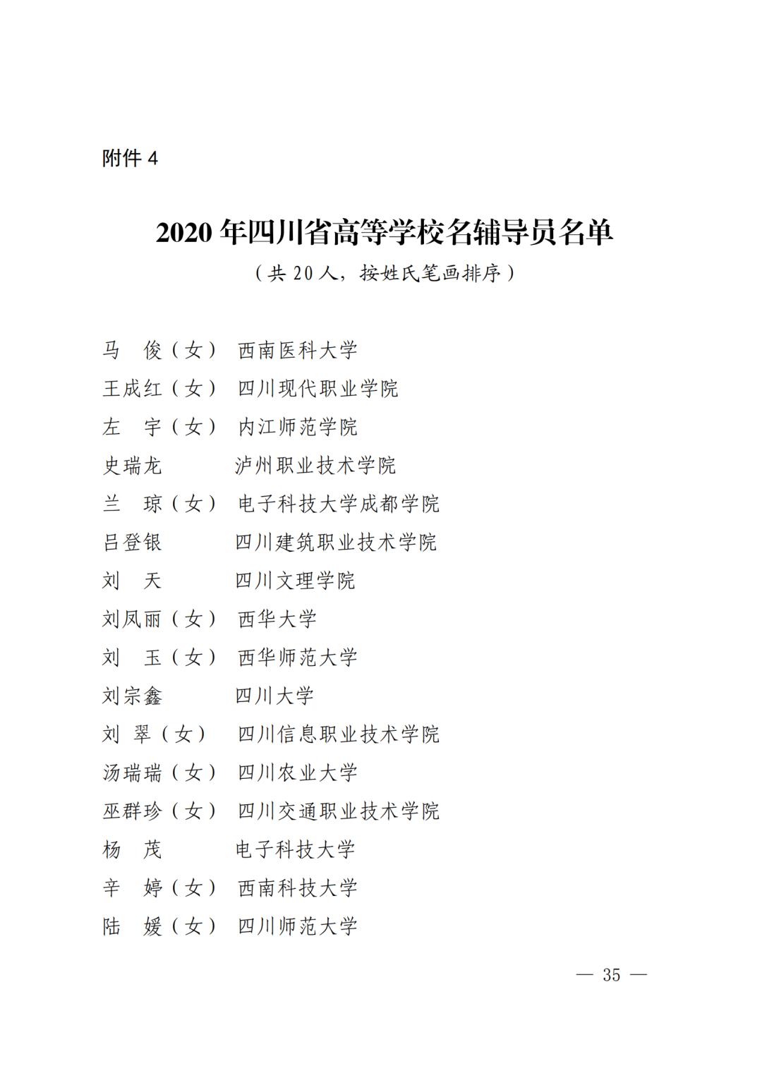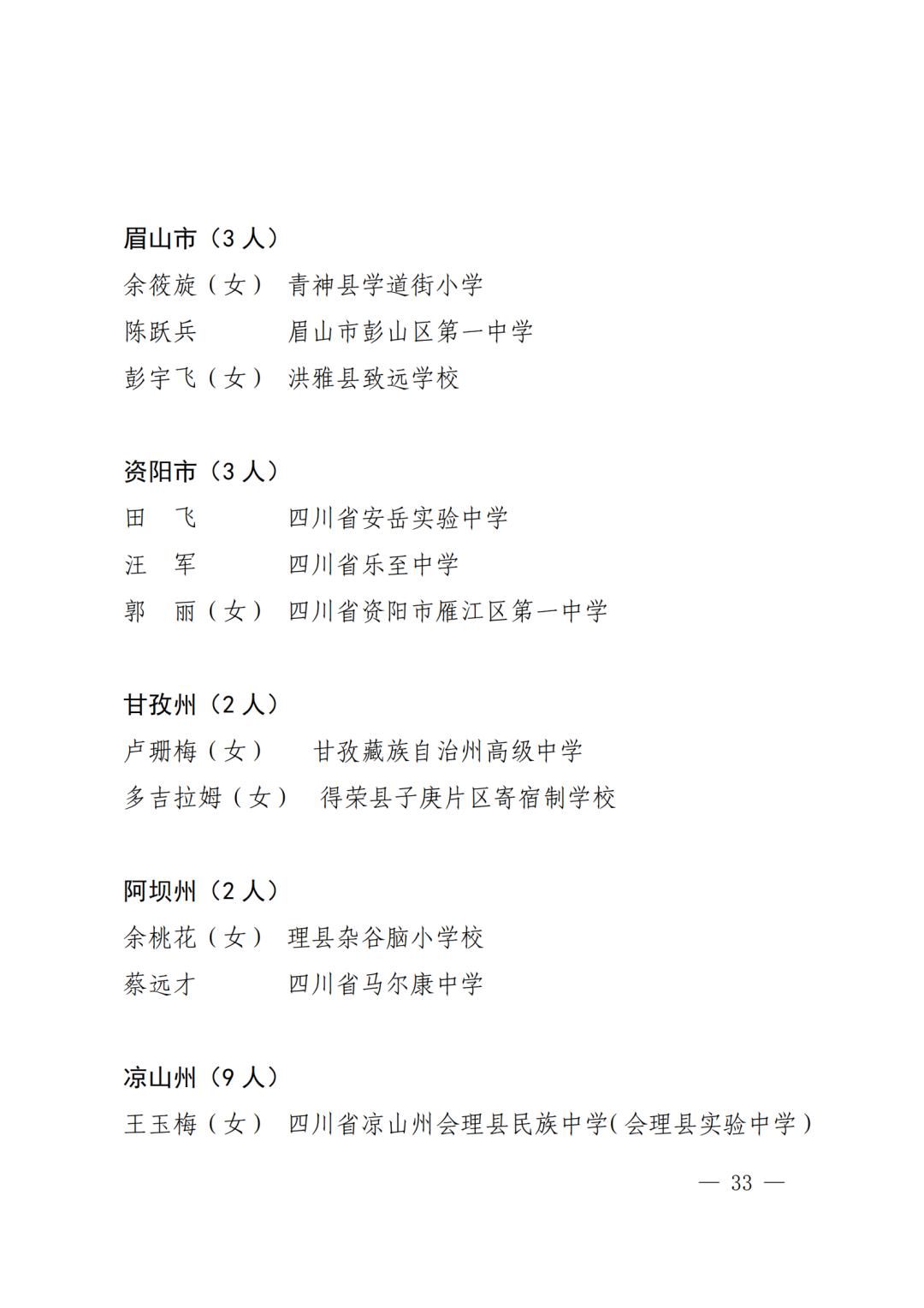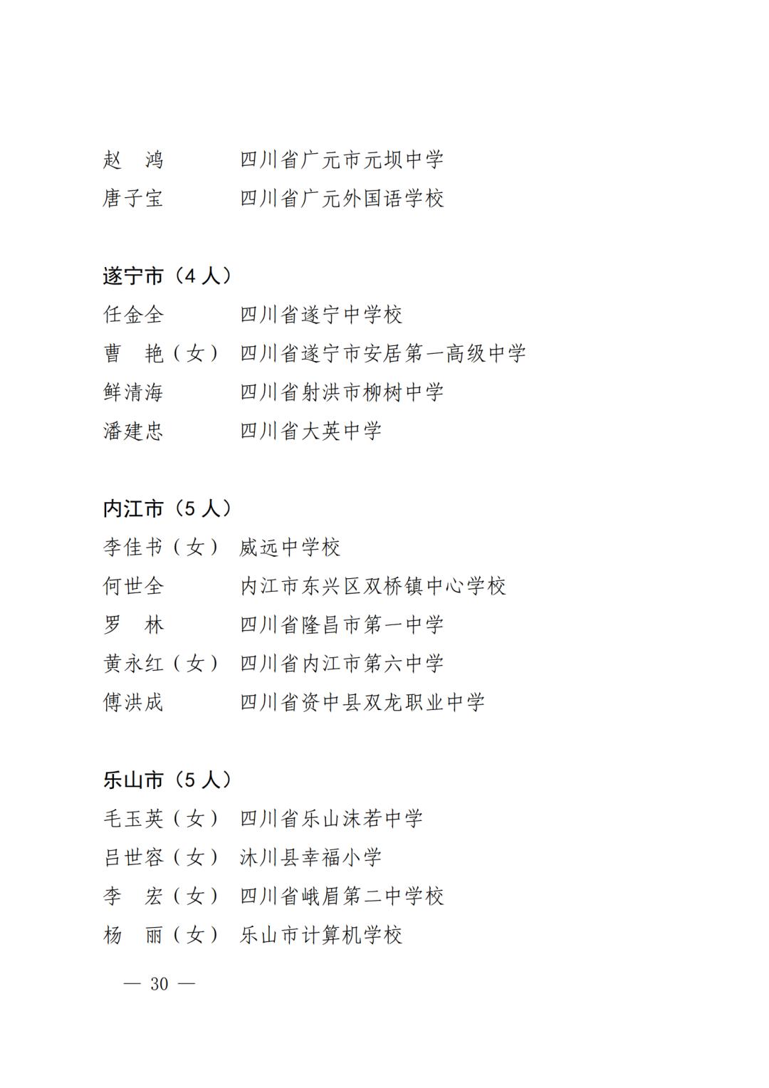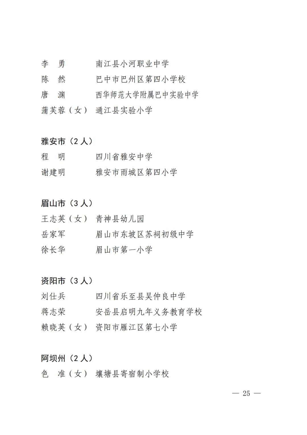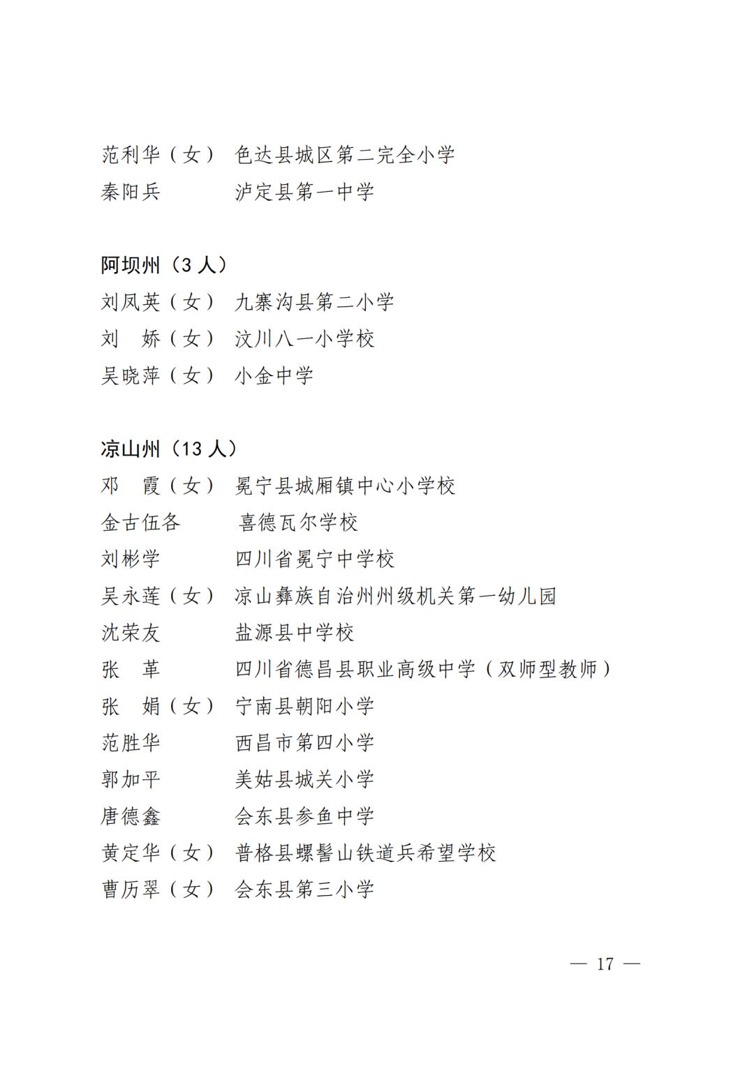 经层层推荐遴选,省委教育工委、教育厅决定授予马永强等251人“四川省教书育人名师”称号,王春等119人“四川省中小学名校长”称号,马杰等109人“四川省中小学名班主任”称号,马俊等20人“四川省高等学校名辅导员”称号。