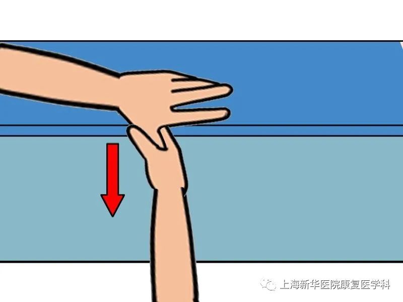 1.腕屈伸。患者坐位前臂旋前放在桌面上,手部垂出桌沿,利用健手压患侧手背提高屈腕角度,用同样方法可改善患腕背伸功能。