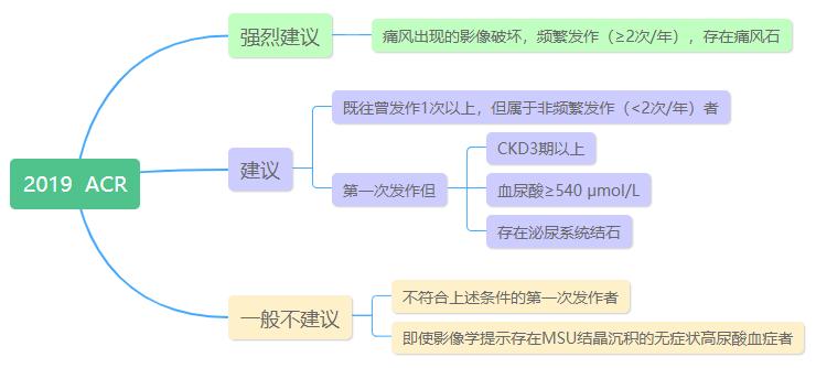 2019年ACR会议上公布的痛风临床实践指南(草案)中,对药物降尿酸治疗的指征按照不同推荐强度给出了建议: