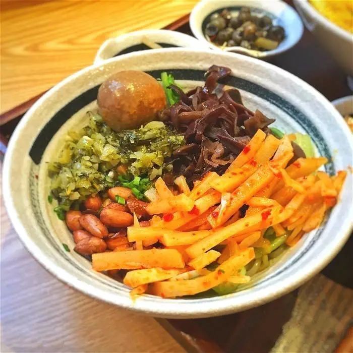 吃法如下:干拌,边拌边吃锅烧、卤肉、油炸黄豆、酸笋、酸豆角,清汤放在一旁想喝的时候喝一口。