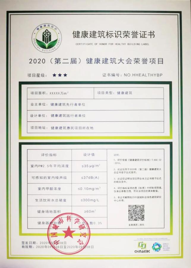 2020年,在全球新冠疫情的防控工作中,青岛银丰·玖玺城进一步凸显了建筑保障健康的重要作用,得到了2020(第二届)健康建筑大会主办机构和全体与会人员的赞誉与首肯,被评为“2020(第二届)健康建筑大会荣誉项目”,项目星级为三星,是目前行业内健康建筑评比出的最高奖项!
