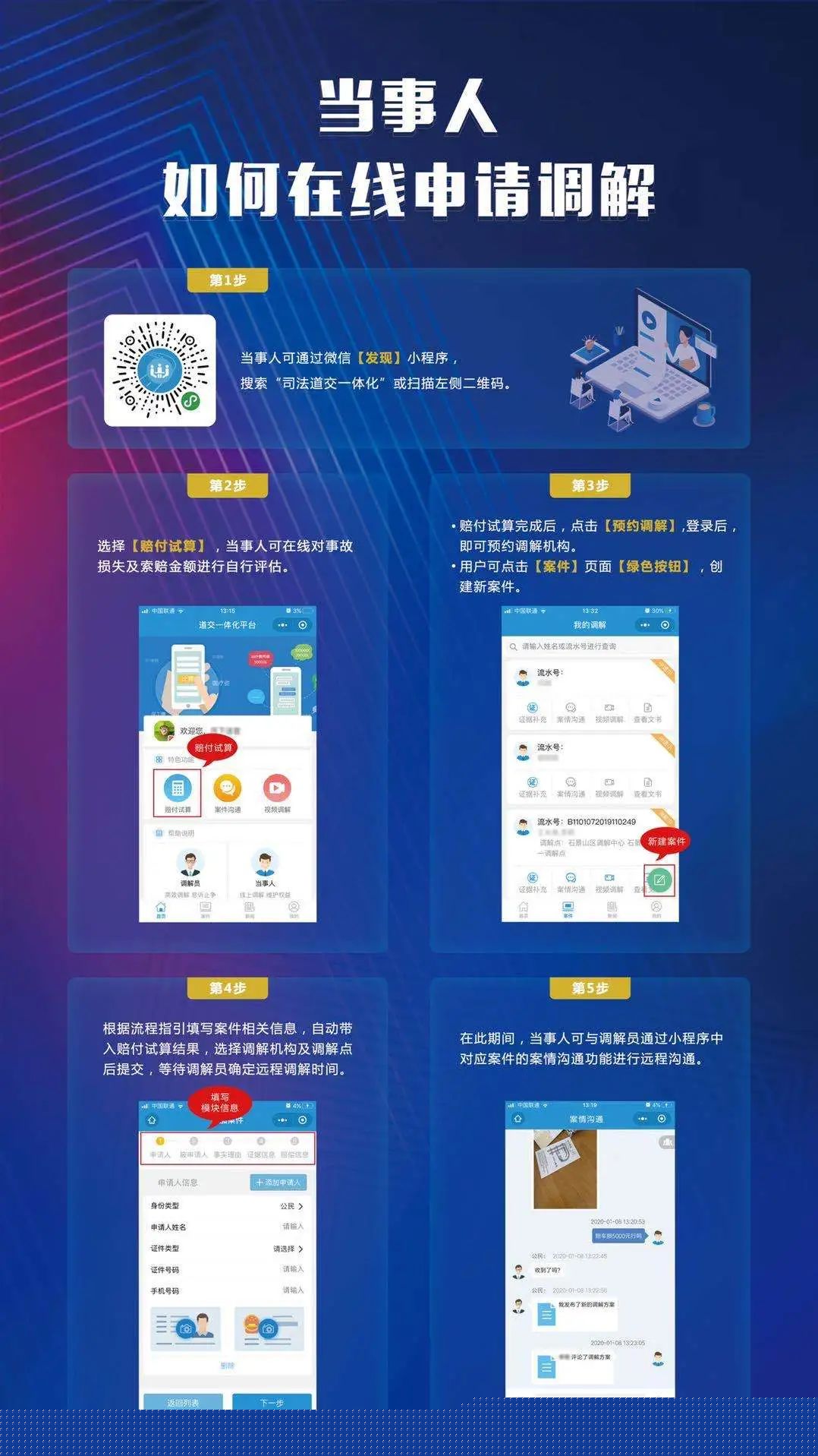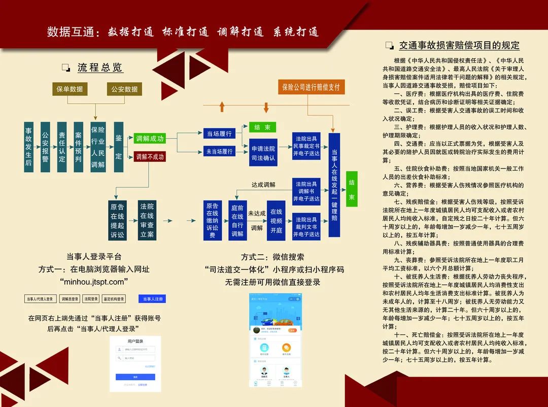 落实“调解优先、诉讼断后、诉非联动”,全流程在线联动解纷。在道交一体化平台前端达成调解协议的,根据在线申请,进行司法确认。调解不成的,在线推送至诉非联动中心,由中心加快分流甄别、速裁快审。