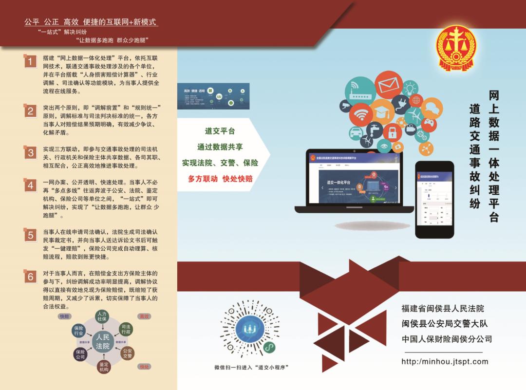 闽侯法院在全市率先探索道路交通事故损害赔偿纠纷一体化处理工作模式,以“调解前置、标准透明、规则统一”为核心,通过打造“道路交通事故处理一体化平台”,全省首家实现单方在线诉前鉴定线上摇号功能。同时,平台搭载“人身损害赔偿计算器”、司法调解、司法确认等功能模块,实现法院、公安交管、保险流程衔接、系统对接和数据共享,并与诉非联动中心系统交互对接,将大量交通事故纠纷解决在诉前,为人民群众提供全流程、全线化、一站式的解纷渠道和服务。