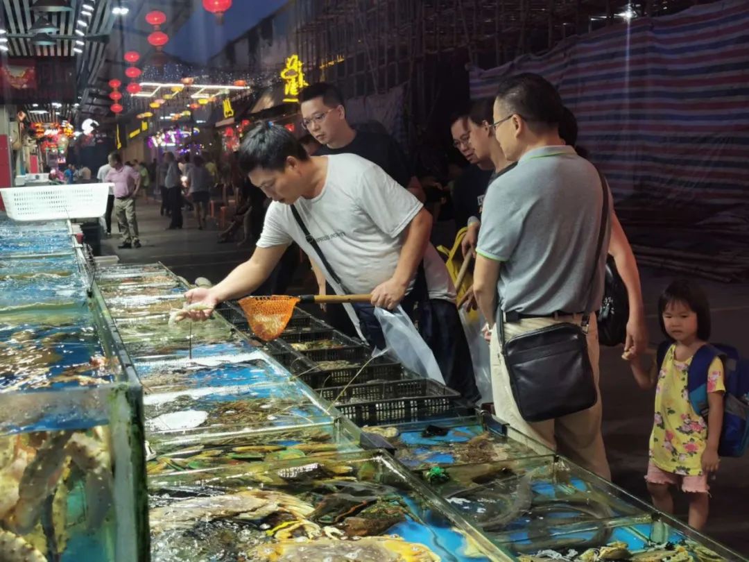 在蓬江区远洋海鲜食街,沿街的灯光让美食街越夜越美丽:一边各式时令海鲜琳琅满目,新鲜食材在眼前一览无遗,另一边是整洁的环境、顾客大快朵颐的笑脸印证了食物的新鲜与美味。