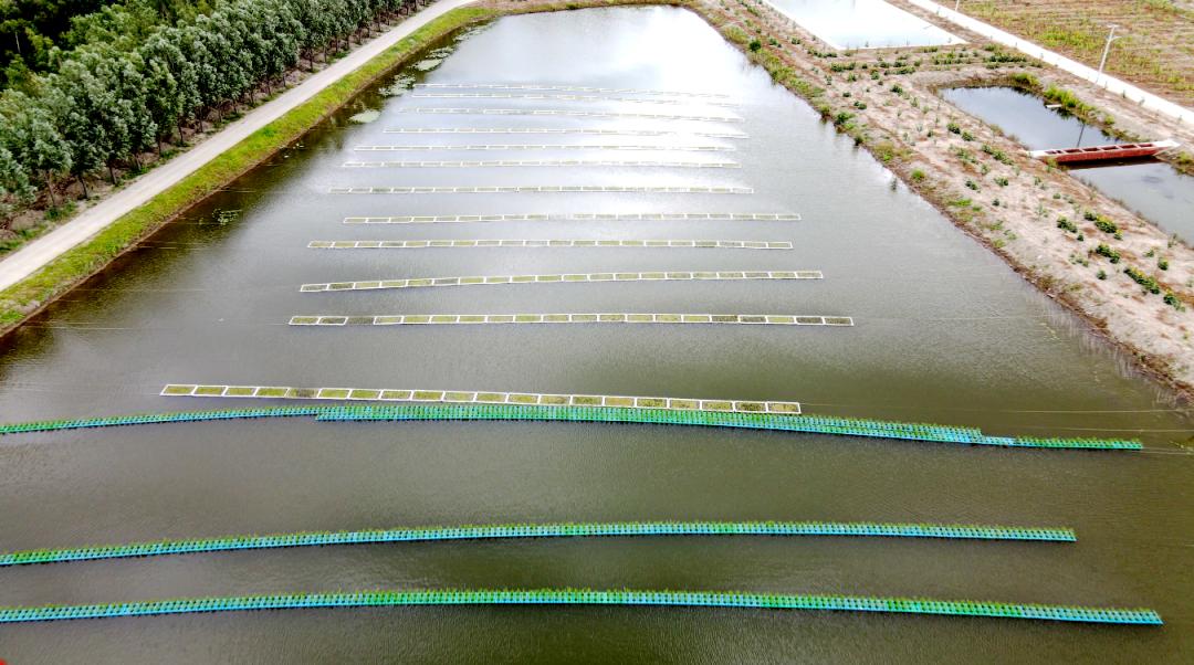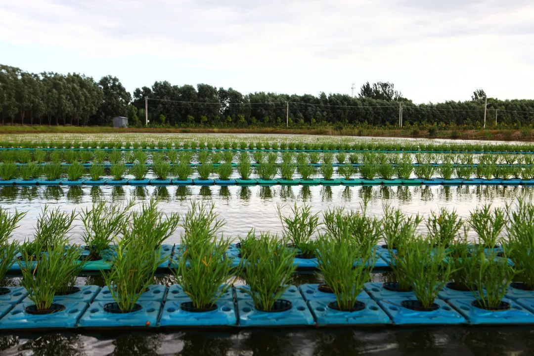 观摩种在尾水处理池塘水面上的蔬菜,