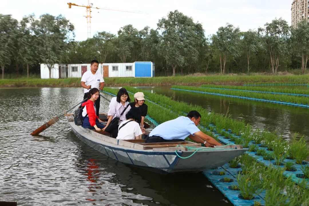 时下正值园区的水培空心菜成熟,新媒体记者一行乘着小船,
