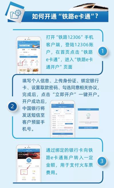 开通“e卡通”后,旅客需登陆“铁路12306”手机客户端,进入“e卡通”界面,按照系统提示,在线完成信息填写和二代居民身份证的人证比对,提交申请后即可开通账户。具体操作可点击此处超链接:https://mp.weixin.qq.com/s/fektfCRVraVYJzrfAbJVBA。