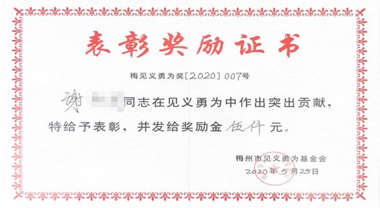 2020年3月22日下午15时左右,谢某正在梅州大桥附近河堤边散步,见一人在河中挣扎,浮浮沉沉,看上去体力透支。在这千钧一发之际,谢某不顾自身安危跳入河中,成功把落水人救上岸。2020年5月25日,梅州市见义勇为基金会对谢某颁发了表彰奖励证书。