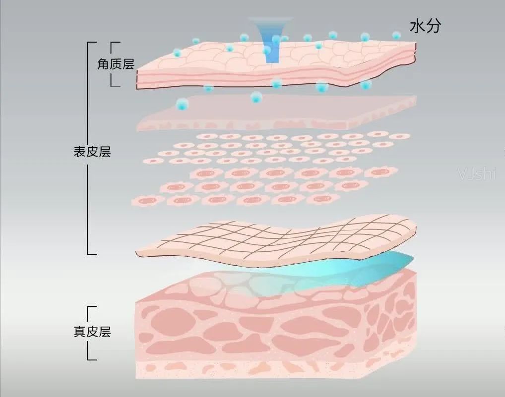 一定要注意,皮肤只有表皮层中的角质层才会缺水。某些保湿产品宣称可以为真皮层补水,基本是不靠谱的,角质层的主要作用就是阻挡水分,水分不可能通过外用到达真皮层。