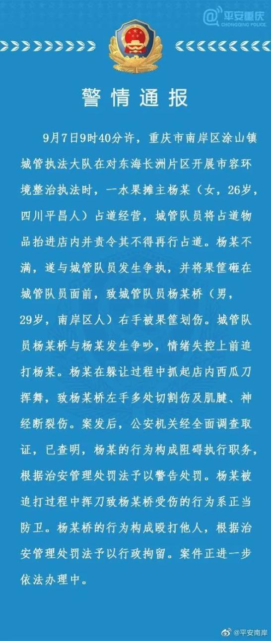 重庆市公安局南岸区分局发布通报称:9月7日9时40分许,重庆市南岸区涂山镇城管执法大队在对东海长洲片区开展市容环境整治执法时,一水果摊主杨某(女,26岁,四川平昌人)占道经营,城管队员将占道物品抬进店内并责令其不得再行占道。杨某不满,遂与城管队员发生争执,并将果筐砸在城管队员面前,致城管队员杨某桥(男,29岁,南岸区人)右手被果筐划伤。