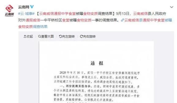 1. 中学食堂食材变质,县教体局局长主动辞职 9月13日,云南省威信县人民政府新闻办公室对外通报该县一校区食堂供餐问题最新处理进展。通报称,视频中蔬菜有腐烂现象、多个泔水桶装满剩菜剩饭、清洗过的蔬菜和土豆放置场地不规范、餐盘中有虫画面属实。视频反映猪肉腐坏变质画面系嫁接拼凑,公安机关已开展调查。县教体局未严格履行监管责任,未及时解决学校师生反映的困难和问题,负有不可推卸的责任。目前县教体局局长已主动辞职。(@云南网)