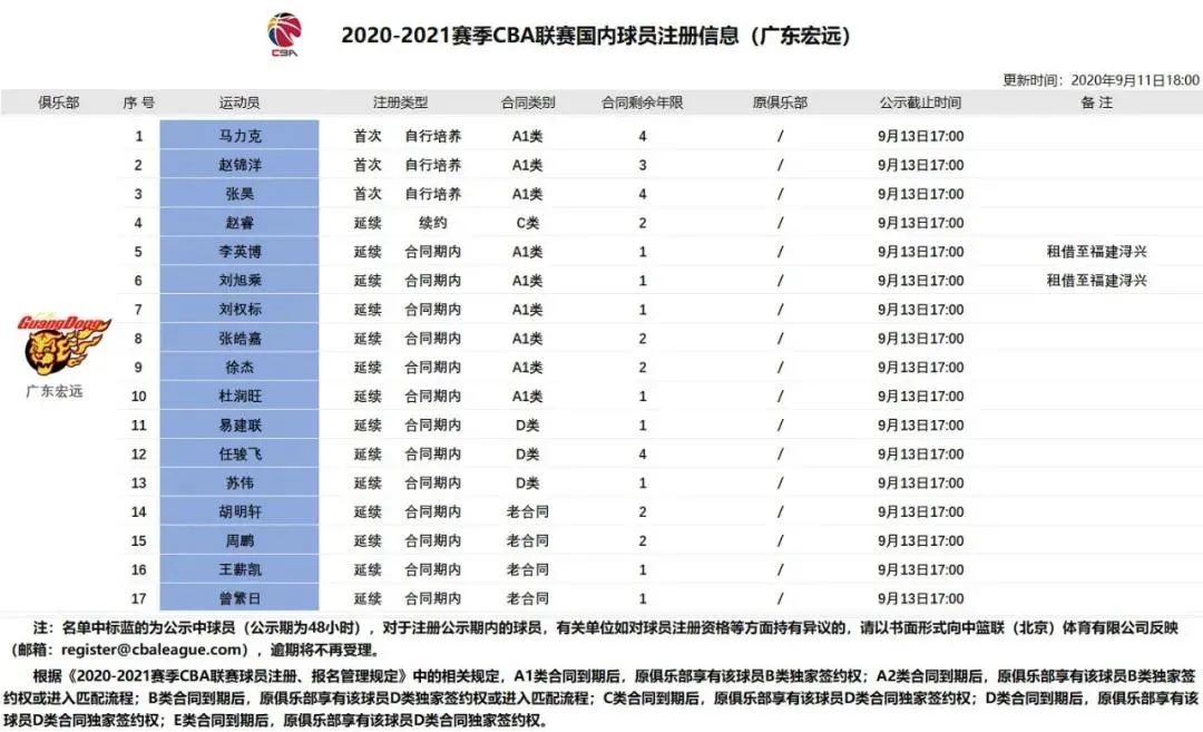 在此前CBA官方公布的球员注册信息表里面,新赛季广东男篮有17人在册,每份合同的明细类型也得到公示。