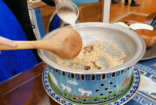 不同的游牧民族,对于奶茶都有一套自有的制作流程。而蒙古奶茶还会加入炒米、牛肉干、爵克(奶制品),用料繁多,滋味复杂,初尝者也许会觉得无法接受,但“真香定律”随时都可能会起作用。