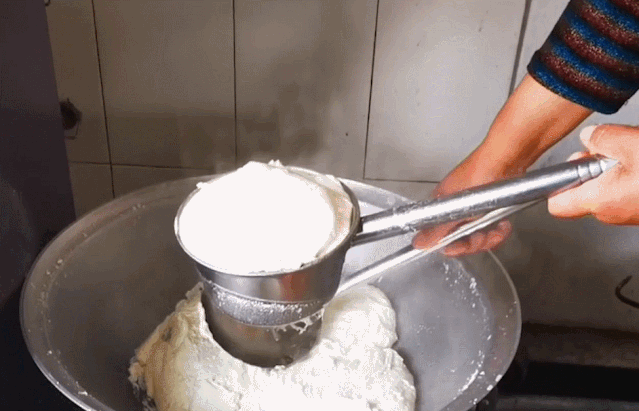 牧民们将驼奶、羊奶、牛乳分别倒入锅中,慢火熬煮,经过一段时间后,表面会凝结出一层蜂窝状的脂肪层,再用筷子挑起,对折晾干,便制成了奶皮子。