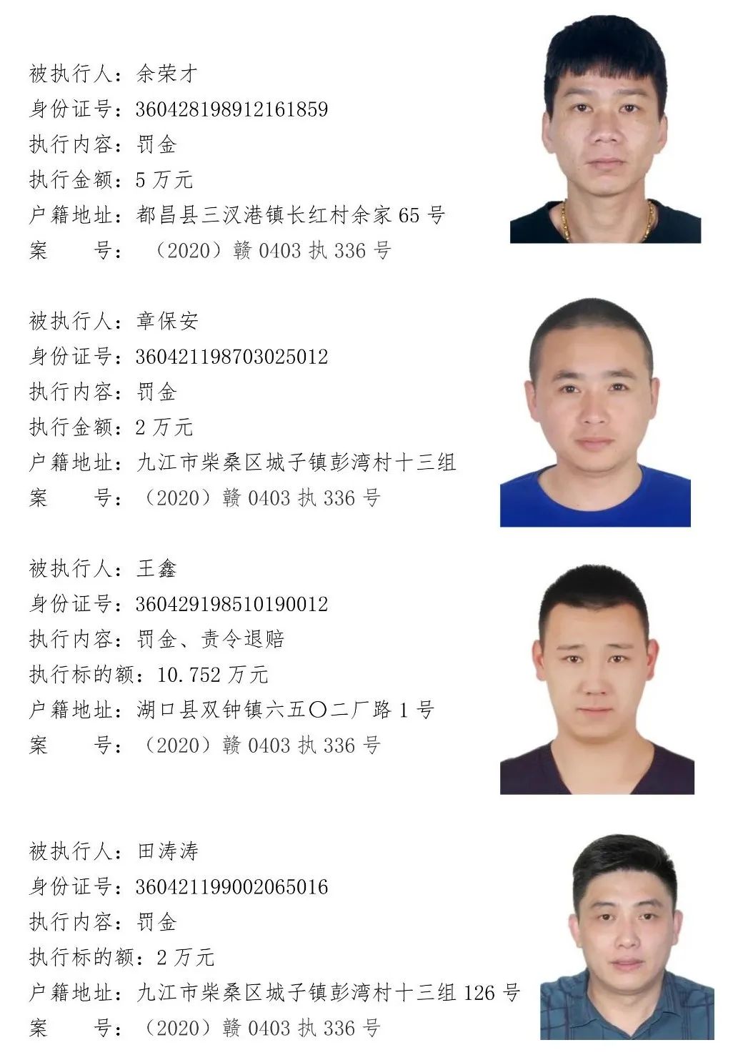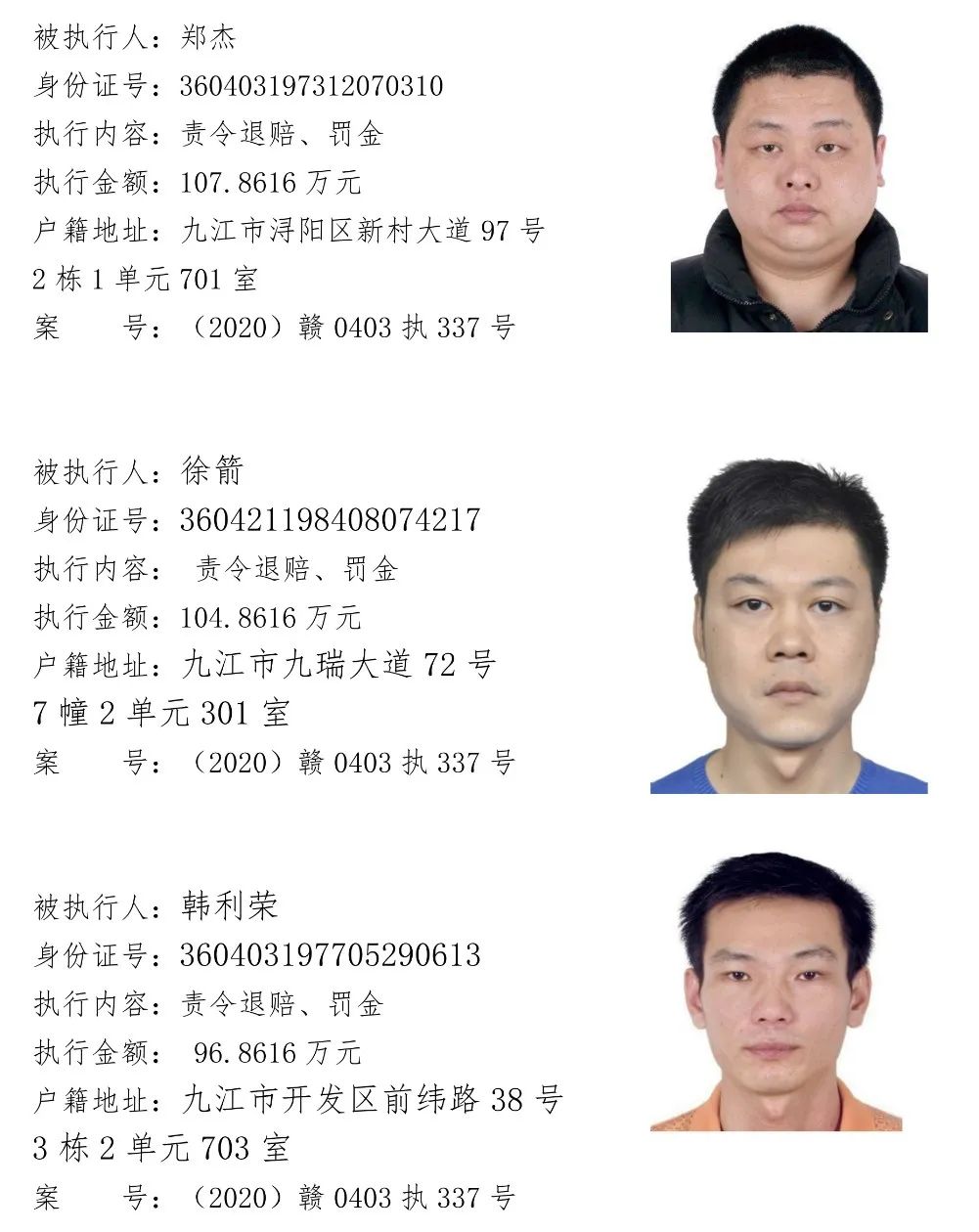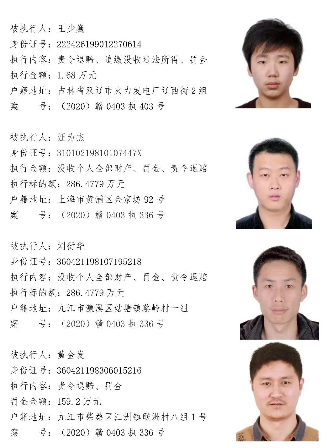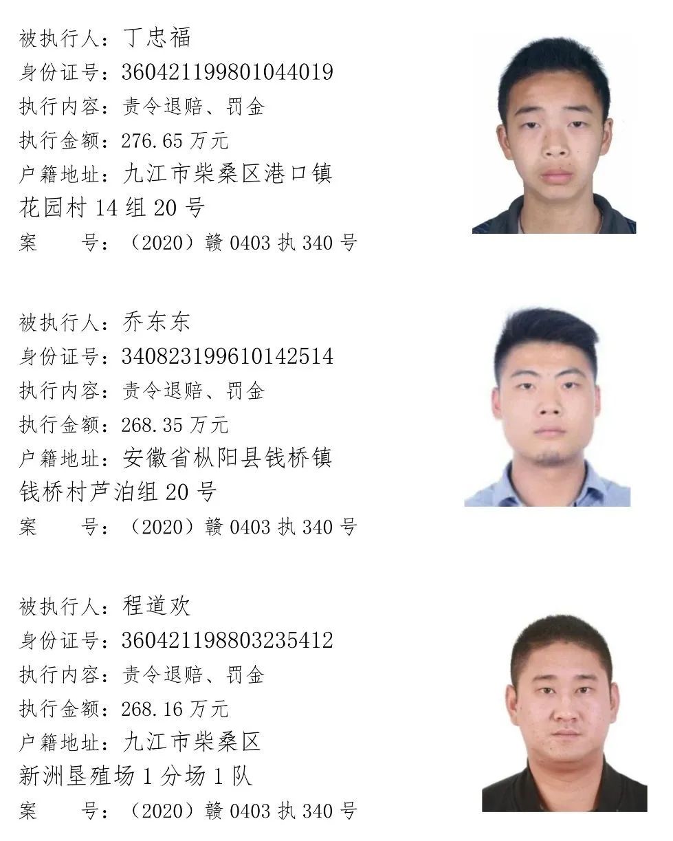 为贯彻落实江西省高级人民法院关于“黑财清底 利剑追击”专项执行活动要求,加大“打财断血”工作力度,彻底铲除黑恶势力的经济基础。浔阳区法院现向社会公开征集下列涉黑涉恶案件被执行人财产线索,详情见下文。浔阳区法院在此郑重承诺:对提供线索的人员身份及其提供线索的情况予以严格保密。