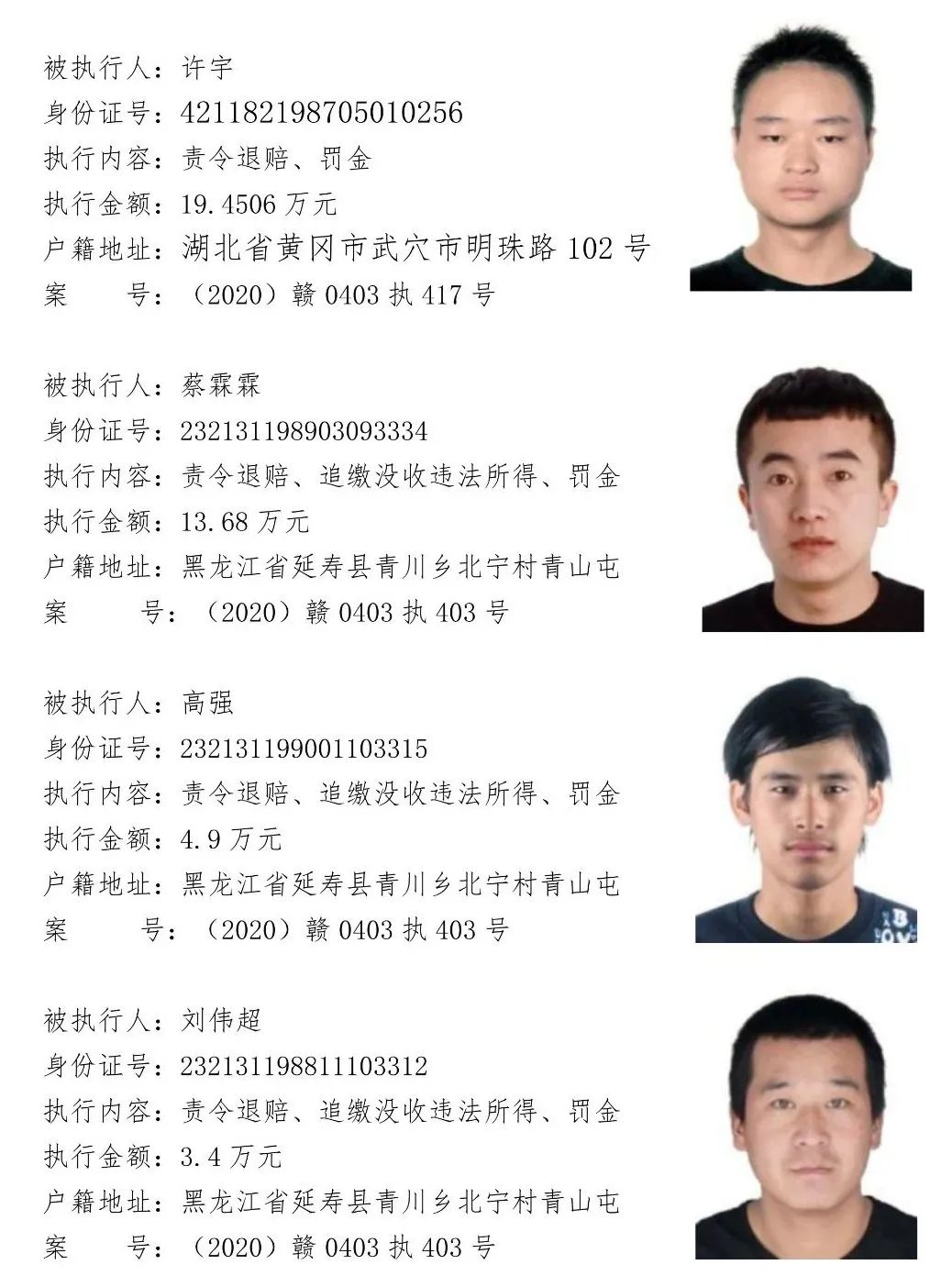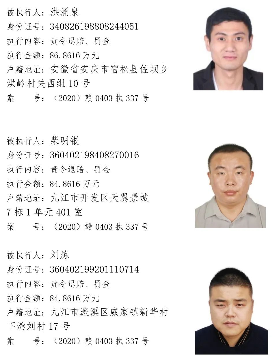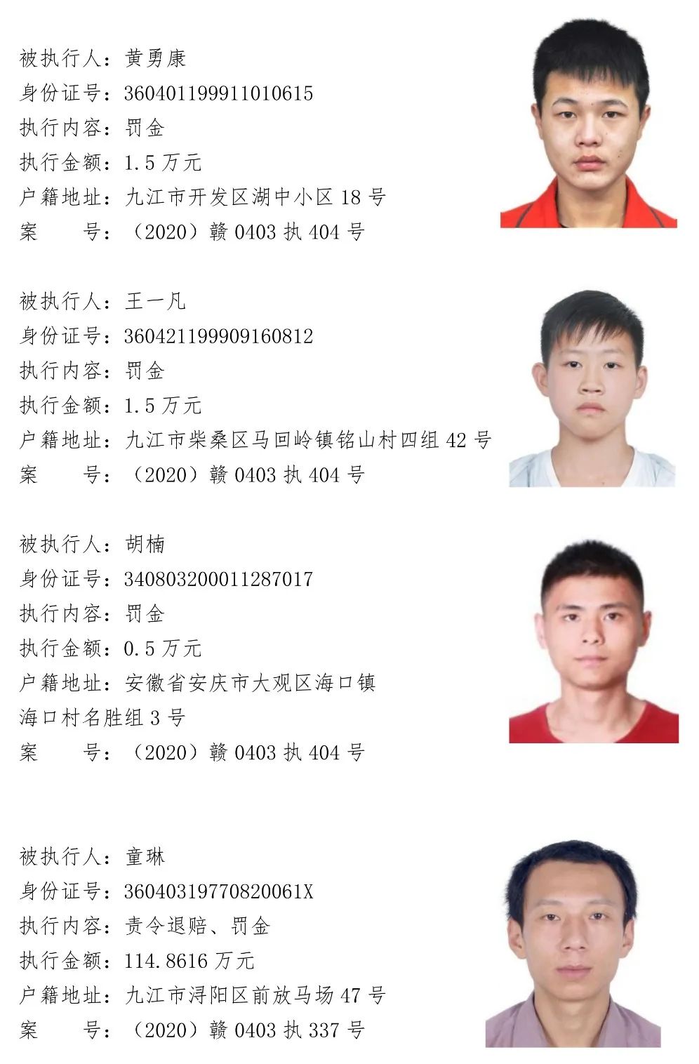 为贯彻落实江西省高级人民法院关于“黑财清底 利剑追击”专项执行活动要求,加大“打财断血”工作力度,彻底铲除黑恶势力的经济基础。浔阳区法院现向社会公开征集下列涉黑涉恶案件被执行人财产线索,详情见下文。浔阳区法院在此郑重承诺:对提供线索的人员身份及其提供线索的情况予以严格保密。