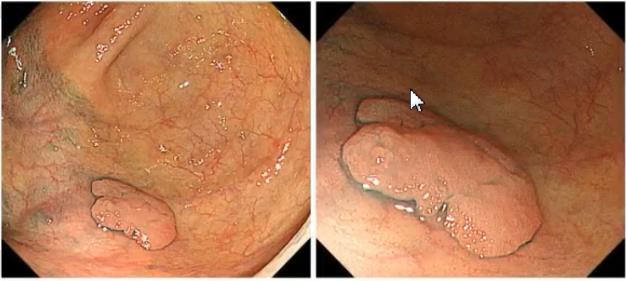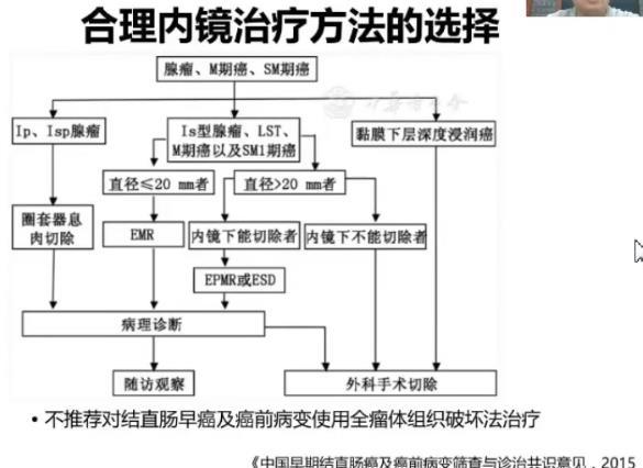 关于这个问题,2015年的专家共识给出了明确的建议,带蒂或者是亚蒂的隆起性病变,直接行圈套器切除。对于扁平隆起型腺瘤、LST、局限于黏膜内、黏膜下浅层的早癌,直径小于20mm者,直接EMR切除;直径大于20mm者内,镜下能切除者可以性EPMR或ESD,内镜不能切除的,建议外科手术。经过评估,如果是黏膜下层深层浸润癌,建议外科手术。