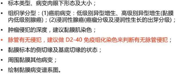 手术标本的规范化的病理评估,对于指导患者后续的治疗是至关重要的,主要包括两个方面,第一方面是规范化的标本处理流程,包括黏膜标本需要充分的平展,做好标本方位的标识,如肛侧、口侧。从垂直于肿瘤最近距离的黏膜切缘,进行切取,每间隔2-3mm平行切开保护息肉蒂部的完整性,充分展示基底切缘。