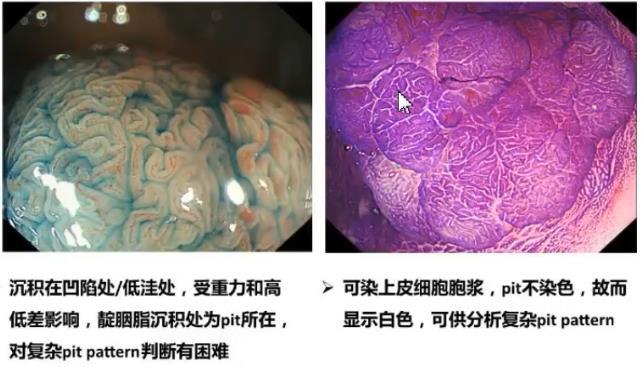 色素染色放大观察腺管开口的形态,靛胭脂沉积在凹陷处、低洼处,受重力和高低差影响,靛胭脂沉积处为pit所在,对复杂pit判断有困难。结晶紫可染上皮细胞胞浆,pit不染色,故而显示白色,可供分析复杂pit。
