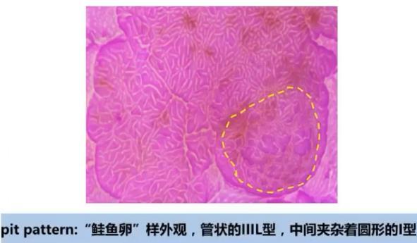 第1步观察微血管和表面的结构,发现病变介于2A和2B之间,用色素内镜进一步评价微表面的结构,经染色后观察pit分型为鲑鱼卵样外观,管状的ⅢL型,中间夹杂着圆形的Ⅰ型,因此这个病变是ⅢL和Ⅰ型混杂,也就是ⅢL-2型。