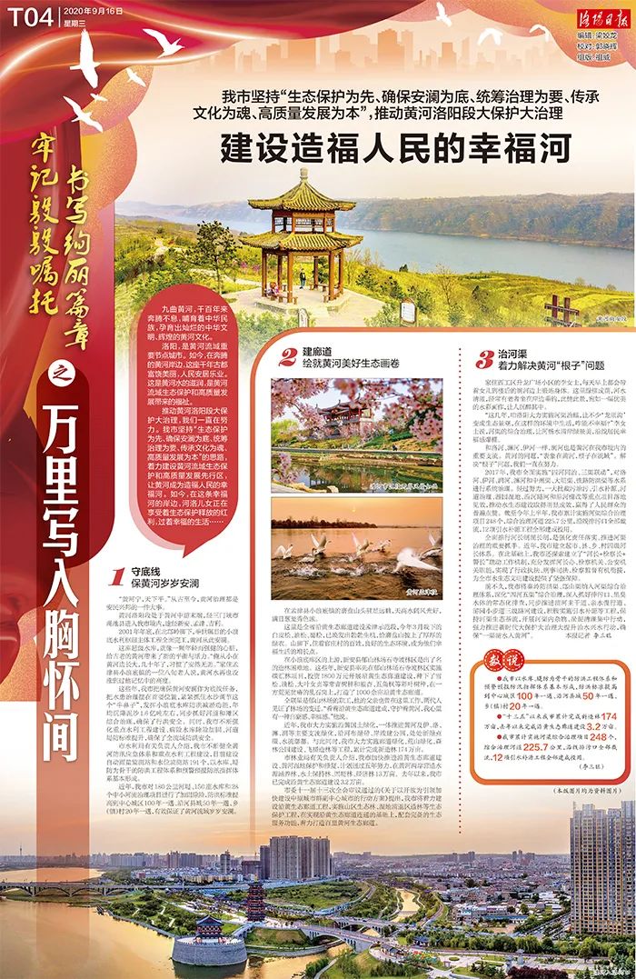 作为中原城市群副中心城市,洛阳是黄河文明的一颗璀璨明珠、黄河流域的一道生态屏障、黄河沿岸的一座重要城市。今日洛阳日报推出特刊,报道我市牢记殷殷嘱托,抢抓中部地区崛起、黄河流域生态保护和高质量发展国家战略的重大机遇,在母亲河畔奋力书写重振雄风、重塑辉煌的“洛阳绚丽篇章”。
