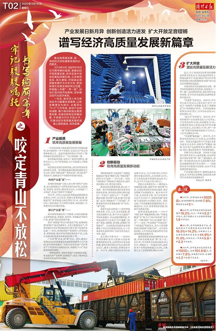 随着创新驱动发展战略的深入实施,洛阳高质量发展“新”意十足:2019年,全市技术合同成交额达48.2亿元,增速比上一年提高30%;高新技术产业增加值增速达16.5%,占规模以上工业增加值比重达44.9%。