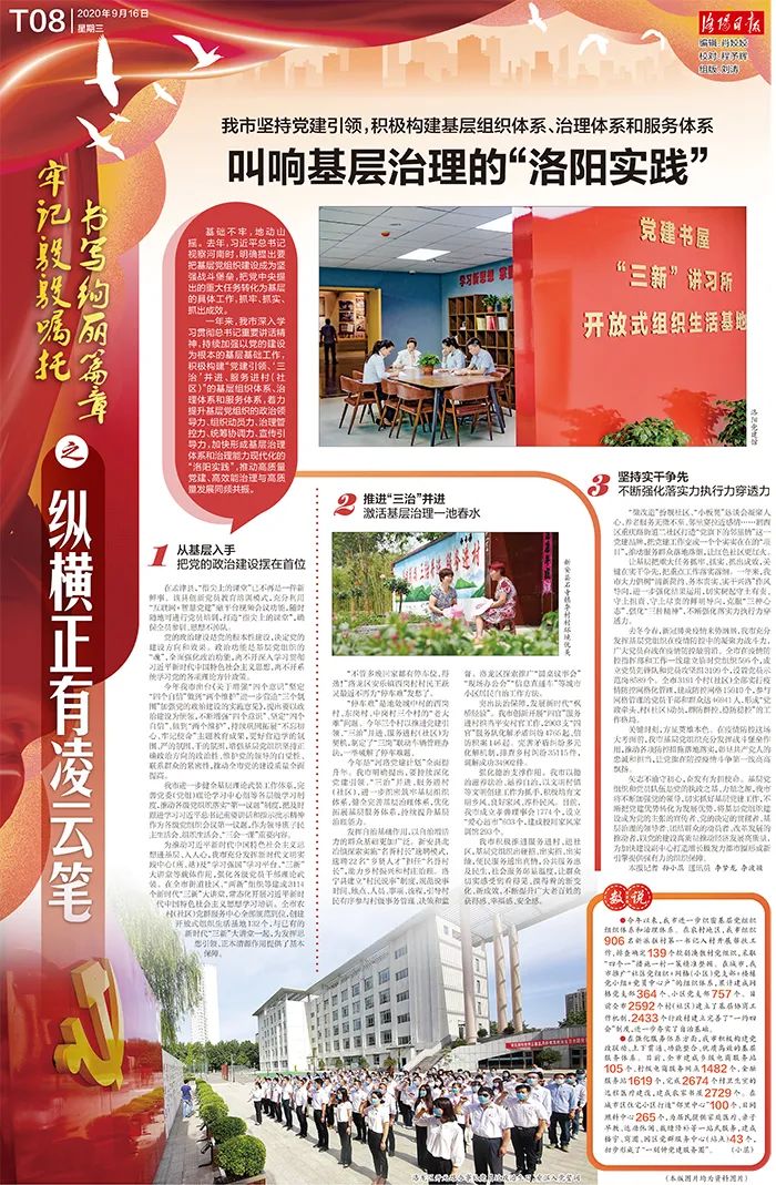 一年来,我市深入学习贯彻总书记重要讲话精神,持续加强以党的建设为根本的基层基础工作,积极构建“党建引领、‘三治’并进、服务进村(社区)”的基层组织体系、治理体系和服务体系,着力提升基层党组织的政治领导力、组织动员力、治理管控力、统筹协调力、宣传引导力,加快形成基层治理体系和治理能力现代化的“洛阳实践”,推动高质量党建、高效能治理与高质量发展同频共振。