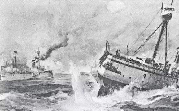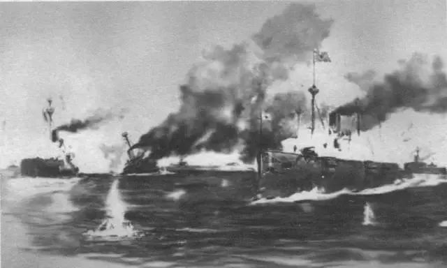 资料片:图中右侧为日舰吉野号,中央倾斜的是致远舰。