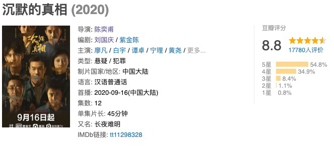 9月16日开播前,《沉默的真相》豆瓣标记想看人数高达4.1万,爱奇艺预约人数为64万,无论是原著粉还是其他悬疑剧爱好者,对这部剧的高期待都显而易见。