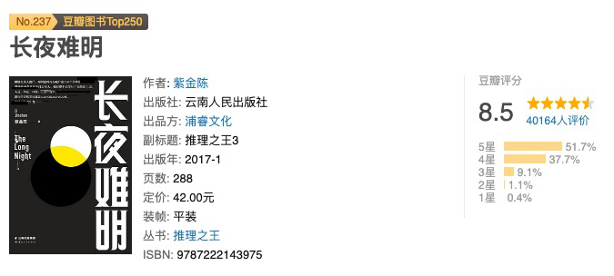 作为紫金陈“社会派”推理系列的第三部,《长夜难明》在豆瓣读书得到了8.5的高分,远高于7分出头的《无证之罪》和《坏小孩》。