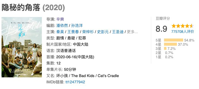 尽管《隐秘的角落》最终在豆瓣上有77万人打出8.9的高分并得以大爆,但前期的数据并不亮眼。在《十日游戏》打头阵迷雾剧场,外加秦昊坐镇的基础上,《隐秘的角落》在开播首日的百度指数仅为11万,远不及《十日游戏》的15万。