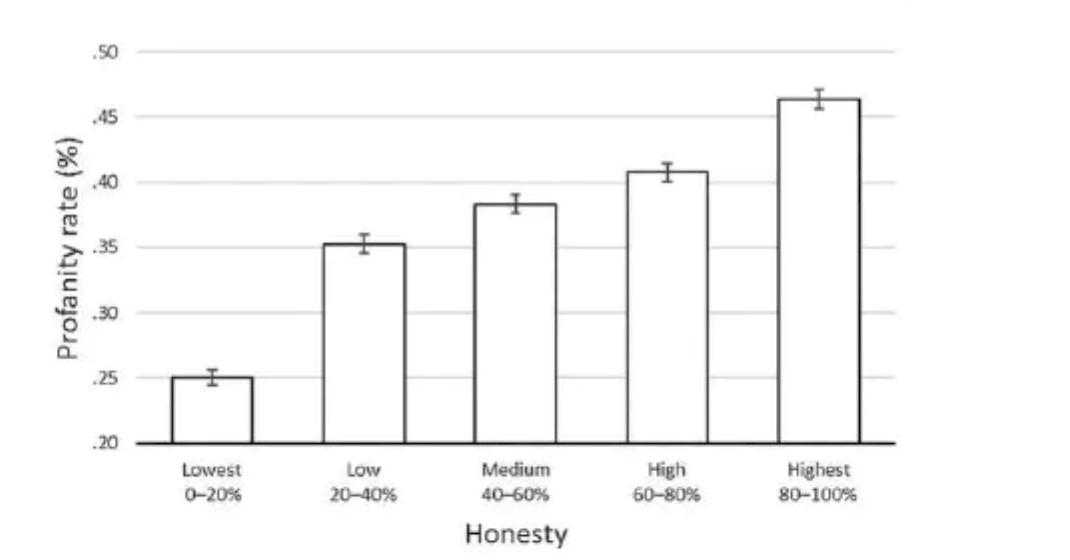 Feldman, G., Lian, H., Kosinski, M., & Stillwell, D. (2017). Frankly, we do give a damn: The relationship between profanity and honesty. Social Psychological and Personality Science, 8(7), 816–826.