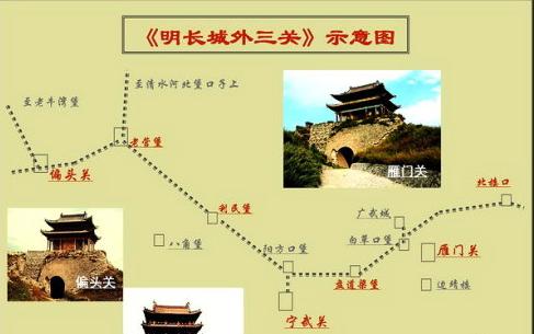 在“内长城”沿线,以现今河北省境内的居庸、紫荆、倒马三关,称为“内三关”。以今山西境内的偏头、宁武、雁门三关,称为“外三关”。