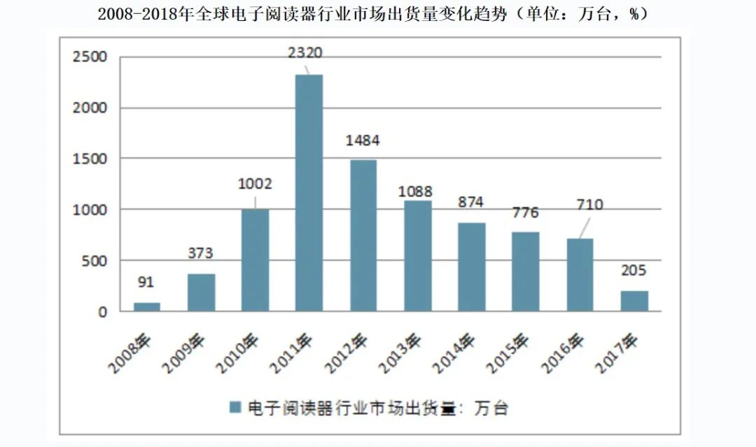 然而就在第二年,受智能手机普及、阅读资源匮乏、盗版横行的影响,全球电子阅读器出货量锐减,2012年全球电子阅读器出货量跳水至1480万台,并且逐年递减态势明显。2017年全球电子阅读器出货量直接降到了205万台,不足巅峰时的十分之一。靠卖设备挣钱的中国电子阅读器更是损失惨重,带头大哥汉王科技在2012年全年亏损1388.43万元。