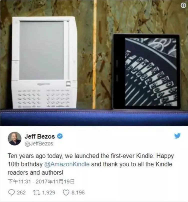 贝索斯在2008年曾表示,电子阅读器很可能是重振萎靡的电子书市场之关键。但在2017年,Kindle推出十周年之际,贝索斯只是在推特上贴出了第一代Kindle和最新版Kindle的对比照片,展现出了Kindle十年以来的外观变化,并低调发文祝贺。