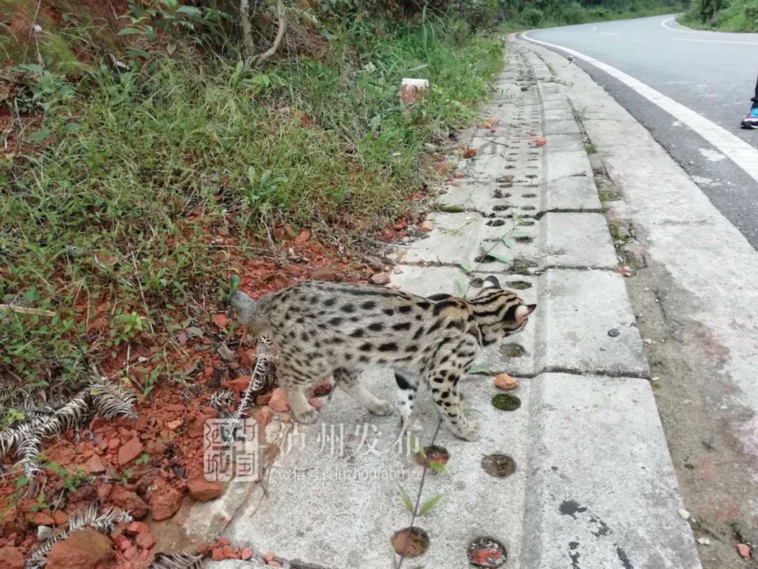 9月20日上午10时许,古蔺通往黄荆公路上,养路段工人徐师傅在普照山段发现一只看上去像家猫、像豹子。看见陌生人,这只小家伙并没有赶紧逃窜,仍然优哉游哉地顺着公路边继续漫步。
