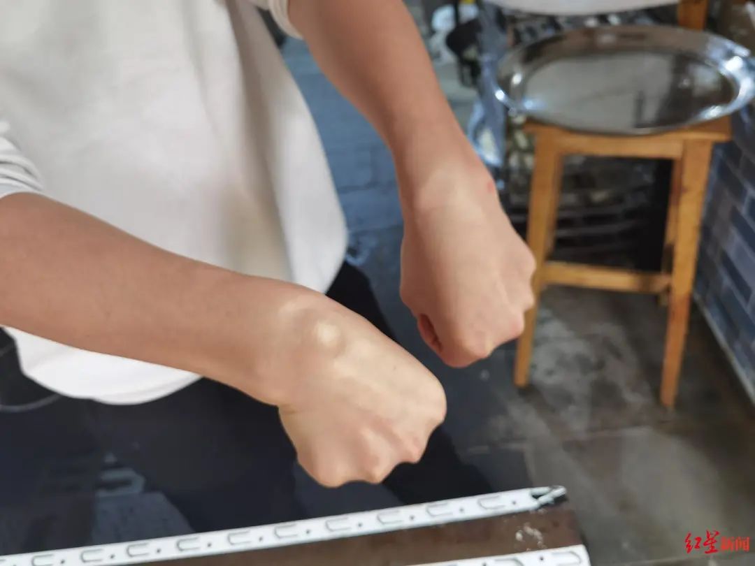 田波将衣服袖口挽起向记者展示右手手背上的一个肿块,“你看,腱鞘囊肿,就是拉面拉出来的。”之前一天要拉上千碗面,一拉就是两三小时,不管是冬天夏天,一次下来,整个衣服都会湿透,现在因为拉面,身体也不太好,“总觉得腰酸背痛的。”