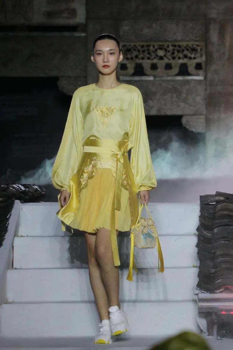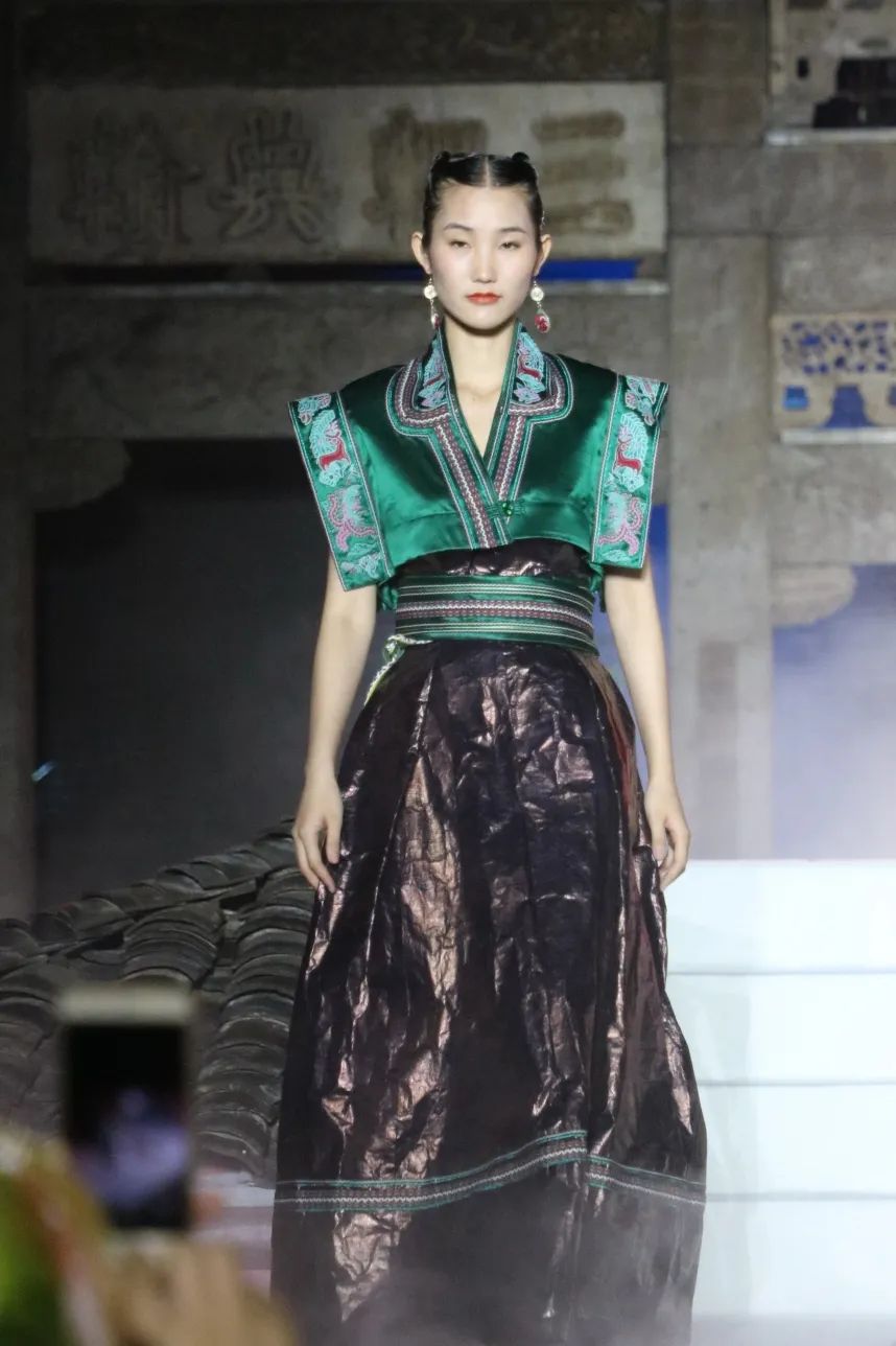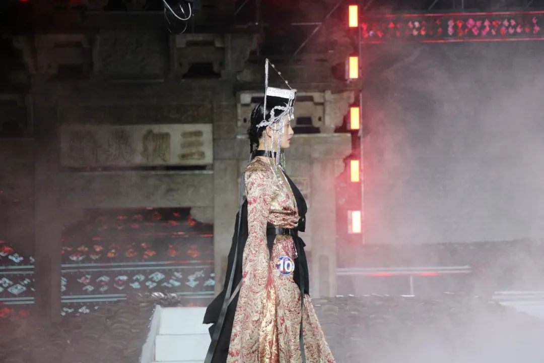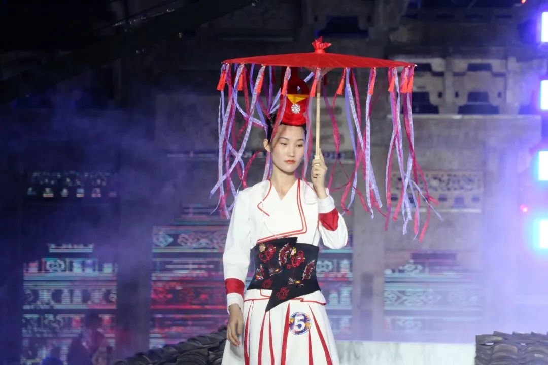 本次展演主题“云中幻城,凤凰霓裳”,是在开放的广场上,由灰色瓦砾和白色云雾组成云海,由原生态畲族民居屋顶瓦片组成座座屋顶,整个场景如同云海漫过屋顶。在缥缈多姿的“云雾”和声光效果中,营造如梦似幻的仙境般的梦幻境界,演员漫步其中,与观众相遇。极具鲜明畲族风俗特色的浸沉式舞台,与观众建立情感共鸣基础,突破传统舞台设计内容同质化严重的困局,使更多人认识畲族,尽情展示畲族服饰的魅力和底蕴,缔造畲族文化的盛宴。
