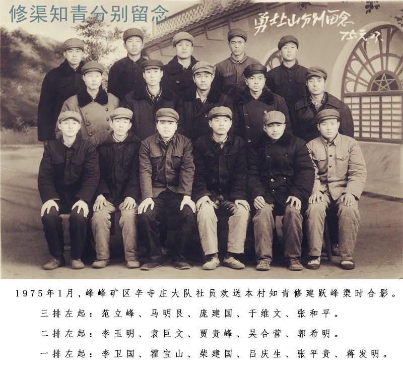 这是1975年元月23日峰峰辛寺庄欢送知青去修跃峰渠时的合影。修建跃峰渠时,许多知青来到了工地,他们年龄大都在15~17岁之间,(也有65年的知青,年龄稍大些),他们修渠道,挖隧洞,建渡槽,把最美的青春献给了跃峰渠。此照片将陈列在“跃峰渠纪念馆”。