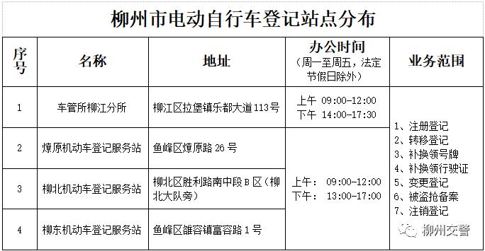 3.购买电动自行车之日起30日内,持车辆所有人身份证明、购车发票或者车辆来历证明、车辆出厂合格证等相关材料到柳州市车管部门申请车辆注册登记,并现场交验车辆。