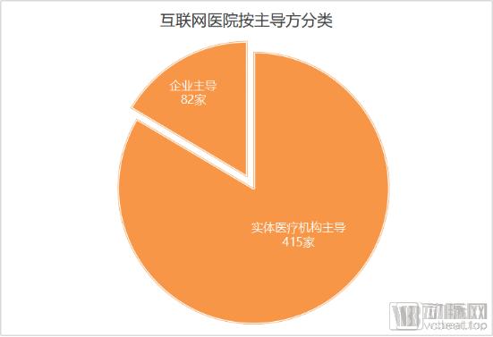 数据截至2020年4月30日,从多个公开渠道搜集到目前497家互联网医院的资料。互联网医院根据申办主体的不同,分为实体医院主导型和企业主导型。497家互联网医院中,有415家是实体医院主导,占83.5%。