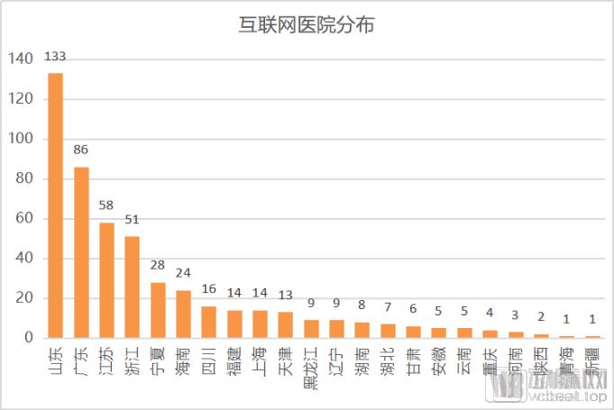 从上图可看出,现阶段互联网医院主要分布在东部、南部沿海省份,这些区域优质医疗资源集中、医疗信息化程度也较高,有良好的基础。其中,山东、江苏、安徽、浙江、福建、广东等省份还被国家卫健委确定为“互联网+医疗健康”示范省。互联网医院最多的几个区域,原本就是进行行业探索较早的地区。目前,山东的互联网医院已达到133家。