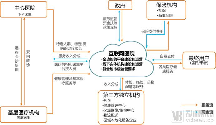 由此可以看出,互联网医院应该是涵盖政府、中心医院、基层医疗机构、第三方独立机构、保险公司,面向居民提供医疗和健康管理的服务体系。
