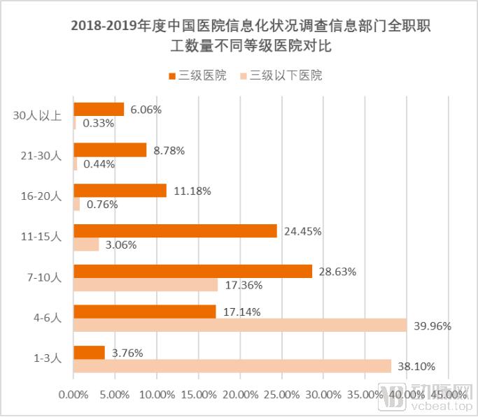 综合以上三点,专业的网络安全人才是医疗机构尤其是互联网医院建设后的网络安全建设关键,只有专业的网络安全人才能够帮助医疗机构合理进行互联网医院网络安全规划。然而根据调查,50%以上的三级医院信息中心人员仅有7-15人,而将近80%的二级医院信息中心人员在6人以内。医院信息中心负责信息化建设以及应用系统和硬件的维护等工作,在这样的人员配比情况下,信息中心人员的工作已经十分紧张。在重业务,轻安全的情况下,医院信息中心真正负责网络安全建设的人员更是寥寥无几。