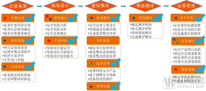 等级保护建设涉及定级备案、规划设计、建设整改、等保测评以及运营管理五个关键步骤。在这五个关键步骤中涉及定级材料准备与上报、网络安全调研与规划、招投标、等保测评材料准备与审批等一系列工作。其中《网络安全等级保护条例(征求意见稿)》将定级备案材料审核时间由原来的30个工作日缩短到10个工作日内。但由于等级保护建设涉及工作内容较多,仍然需要至少1至3个月才能完成。因此为避免由于等级保护建设导致互联网医院上线延期,互联网医院等级保护建设工作应在项目启动阶段就开始落实,与互联网医院信息系统建设同步进行。信息中心人员较少且网络安全建设基础较差的医院,至少应提前完成定级备案工作。