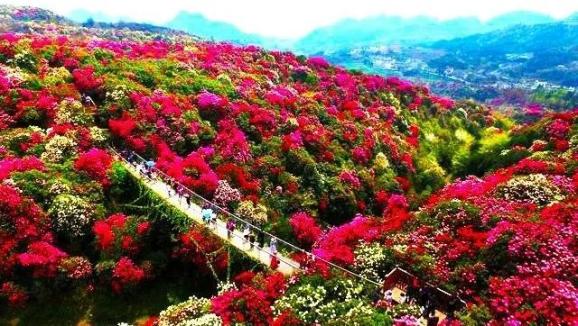 百里杜鹃 ,国家5A级景区因其原始林带宽1~3千米,绵延50余千米得名,是国家级森林公园,2013年成功晋升为5A级景区。初步查明公园内有马缨杜鹃、露珠杜鹃、团花杜鹃等41个品种,囊括了世界杜鹃花5个亚属的全部。这里被誉为“世界上最大的天然花园”,享有“地球彩带、世界花园”之美誉。暮春3月下旬至5月各种杜鹃花竞相怒放,漫山遍野,千姿百态,铺山盖岭,五彩缤纷。