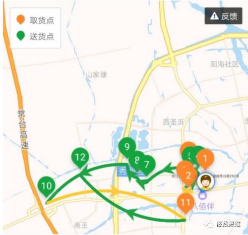 如上图这种,可以算是“单核多线程”,也可以算是“多核多线程”,因为这是系统在送单途中自动再派单的,而按取货点在前两单客户附近算,这个算是“多核多线程”,而按取货点比较集中来说,算是“单核多线程”。