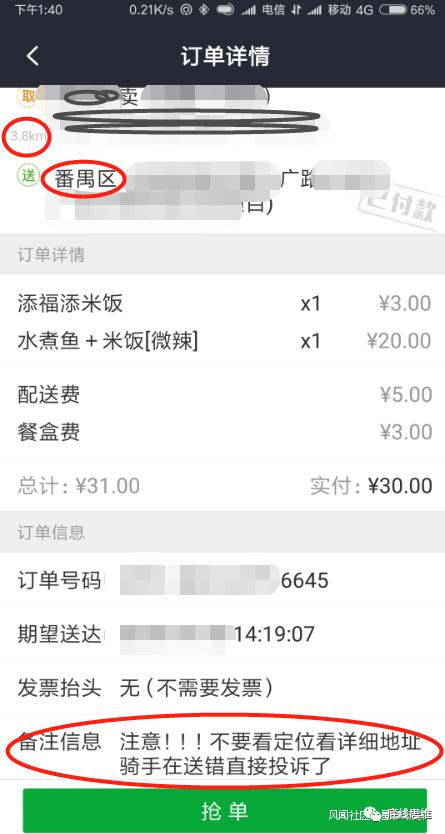 上面这种,一般是懂得规则的无良人下的单。遇到这种单,老手都会截图发在群里提醒其他骑手,而如果新手不小心开了自动抢单而被抢到,当天的取消次数也用完了的话,那只能被扣钱认倒霉。